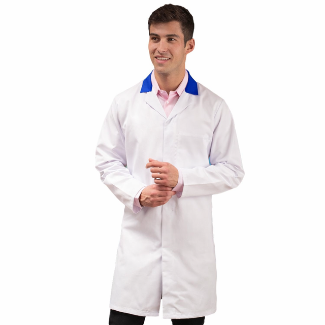 The White Men’s (Unisex) Food Trade Coat with Royal Blue Coloured Collar offers both practical performance and added visual distinction for hygiene-critical workplaces. Made from a robust 245 g/m² (7.25 oz) polyester-cotton blend, this coat is engineered for daily wear in food preparation, catering and laboratory settings. The contrasting royal blue collar provides an eye-catching appearance that can be used for team identification, branding or workflow segregation, while the no external pockets design helps reduce contamination traps. A single internal chest pocket provides secure storage for small essentials.